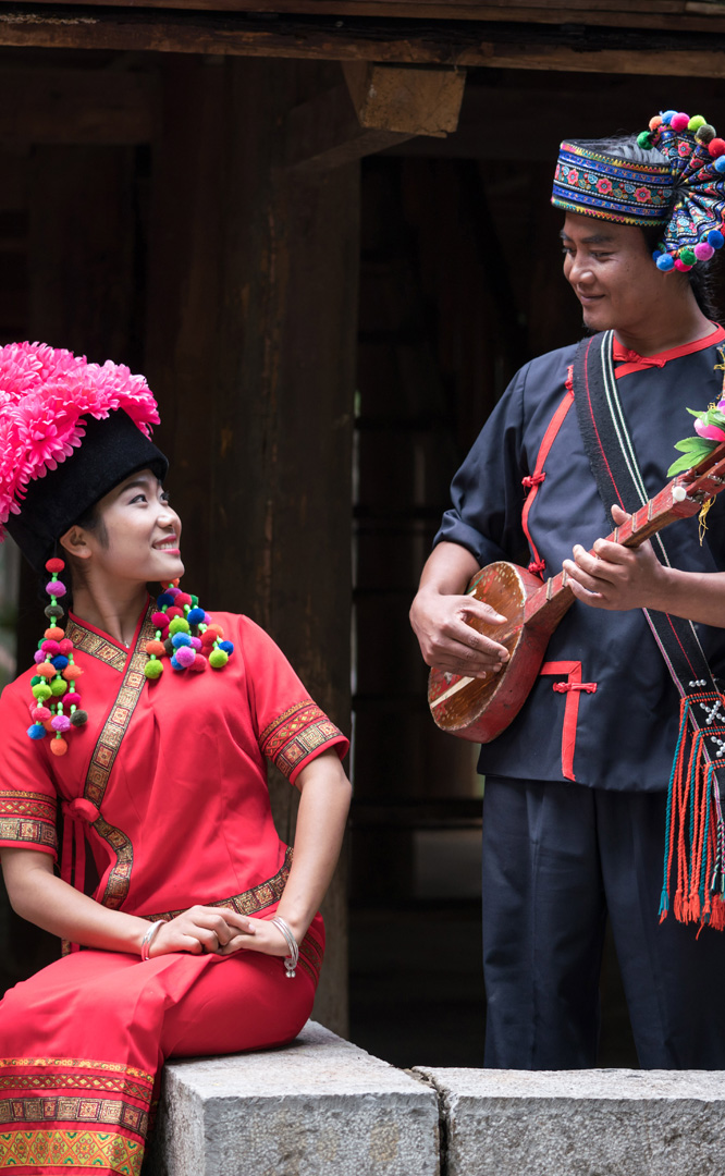 云南壯族主要聚居在文山州,人口114萬,民間的村寨大多依山傍水。壯族擅長種植水稻,有太陽崇拜和長老崇拜的風俗,視銅鼓為重器,厚愛銀飾,善烹制五色花米飯,能歌善舞,熱情好客。進入景區(qū)壯族村,迎面有祭祀龍王的龍柱,兩邊是先民繪制的天王崖畫和為紀念傳說洪水泛濫時幫助先民度過劫難而建的石葫蘆亭。祭祀玉皇大帝的昊天閣和傳說能驅(qū)邪納福的碩大銅鼓聳立在廣場兩側(cè)。桿欄式和麻欄式民居、壯族青年社交休憩的“情廊”、村...